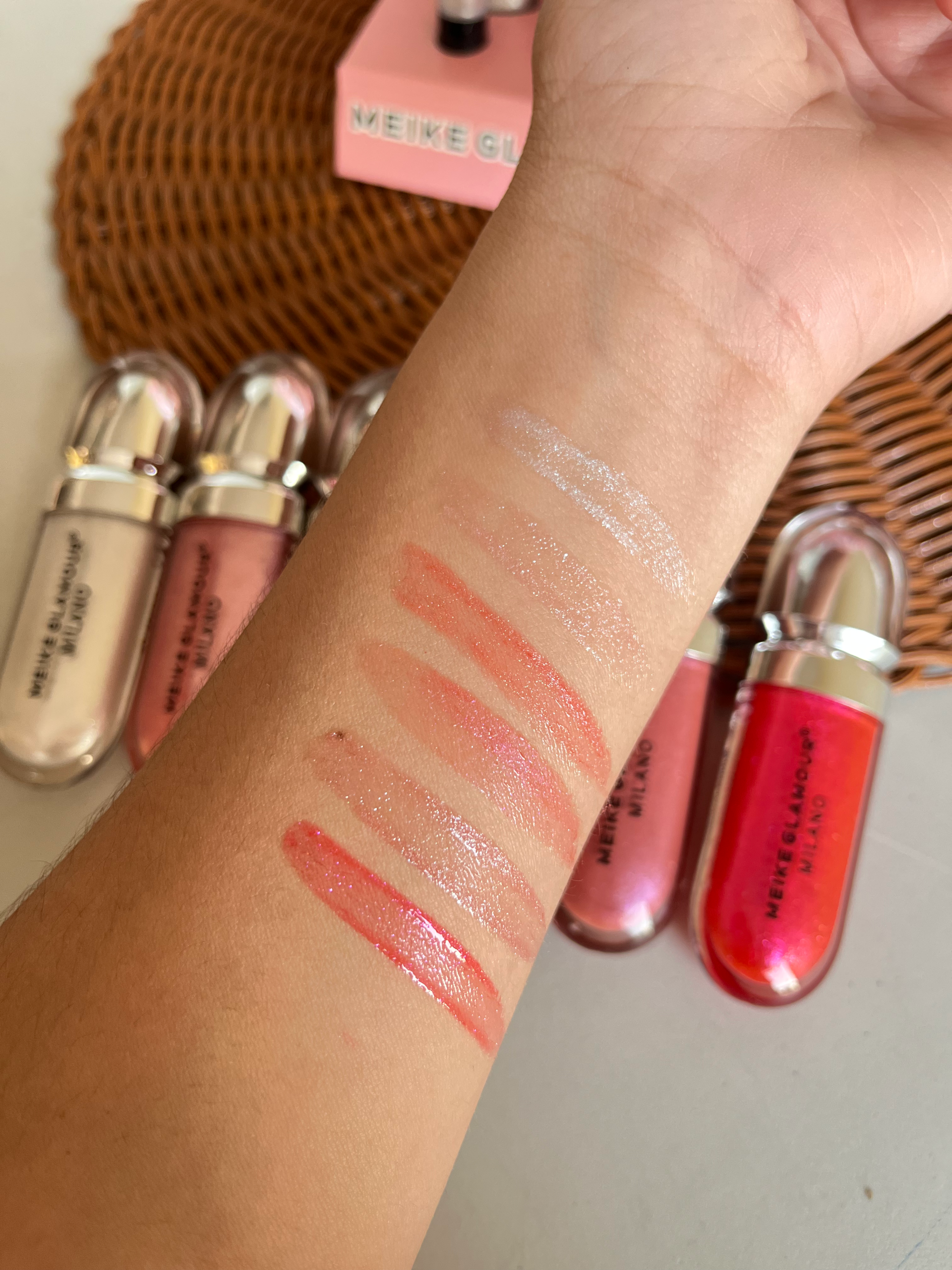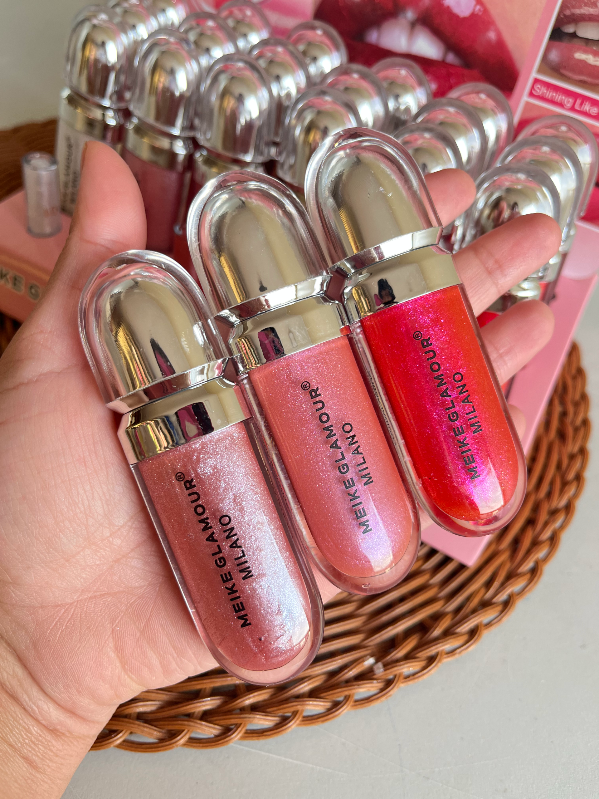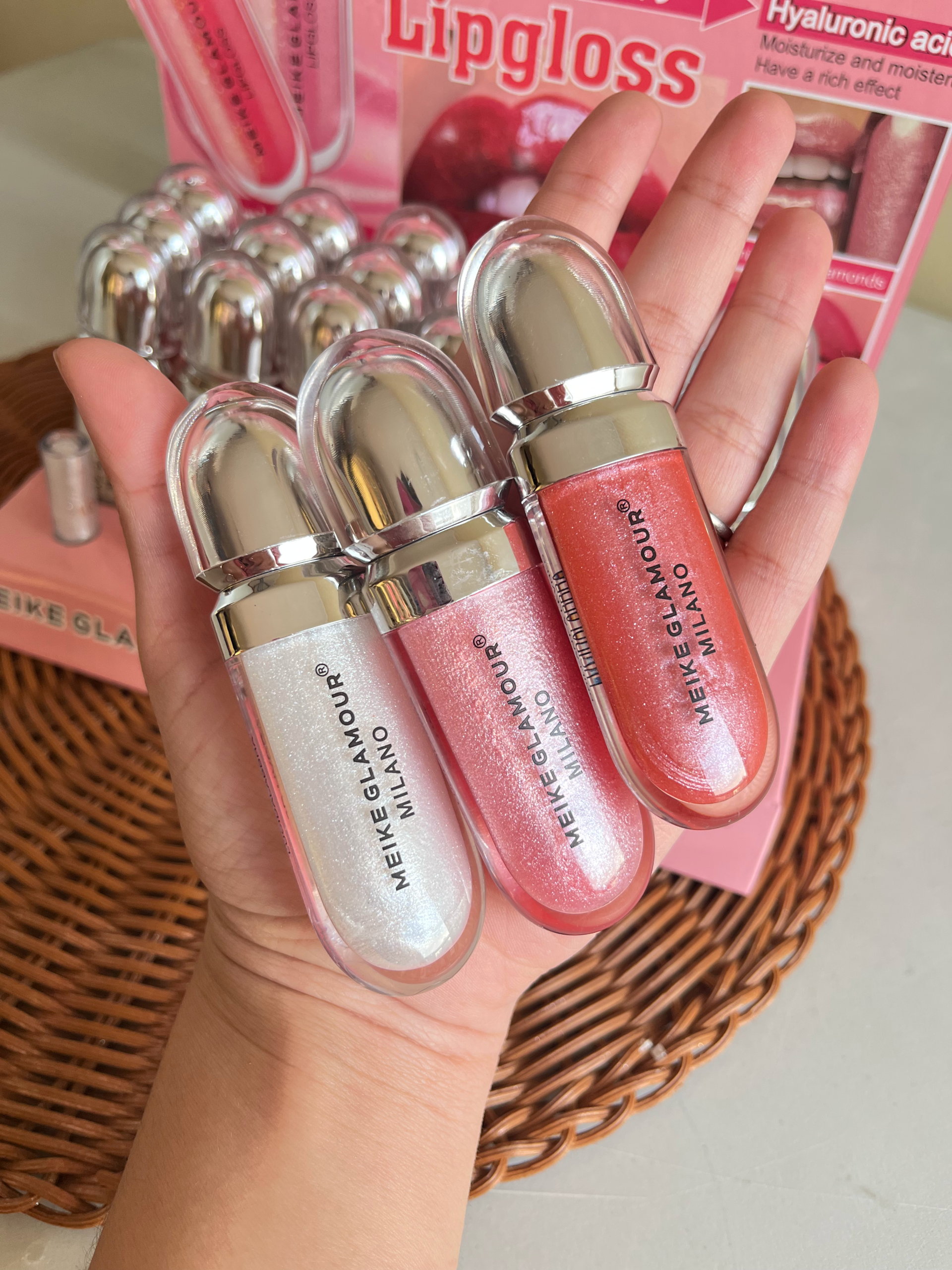 Disfruta del brillo elegante y la textura ligera con el gloss dupe de Kiko Milano de Meike Glamour, ideal para lograr unos labios jugosos y radiantes.