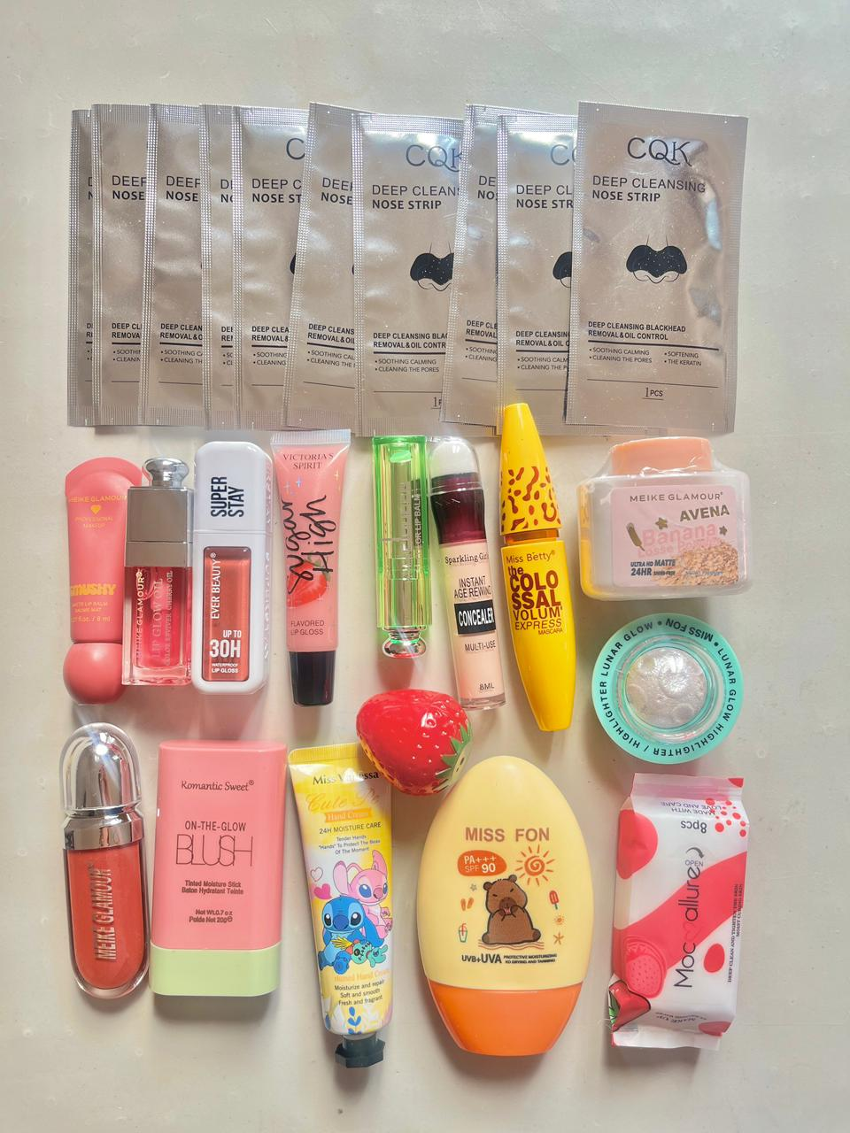 Productos surtidos como labiales, gloss, rubor, iluminador, sombras y más