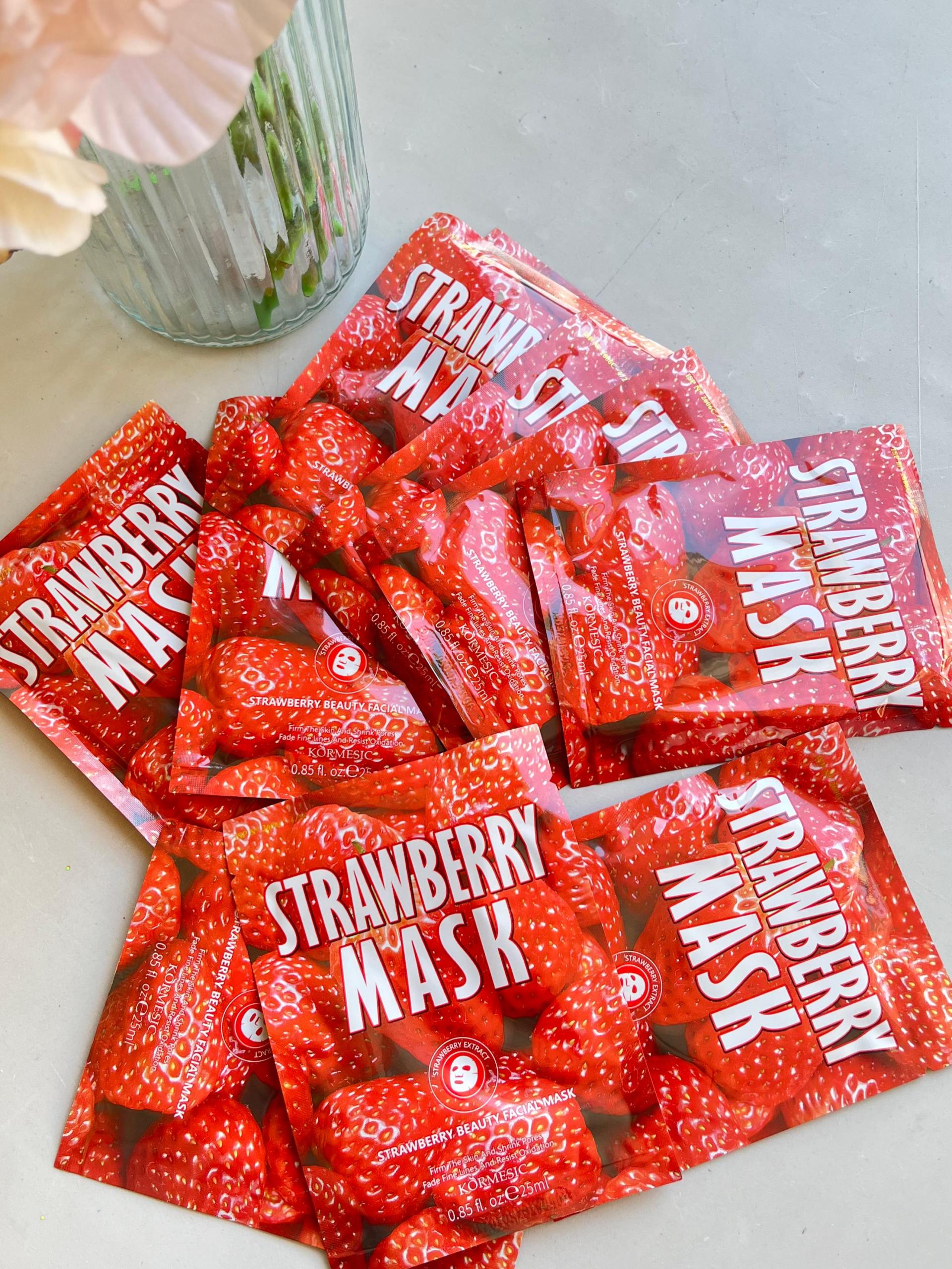 Consiente tu piel con el pack de 10 mascarillas faciales de frutilla Kormesic, ideales para revender o sumar a tu stock de cuidado facial 🍓.